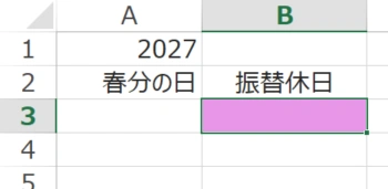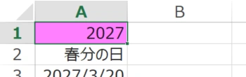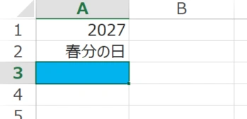 で、春分の日の式を入力するセルを「A3」とします。