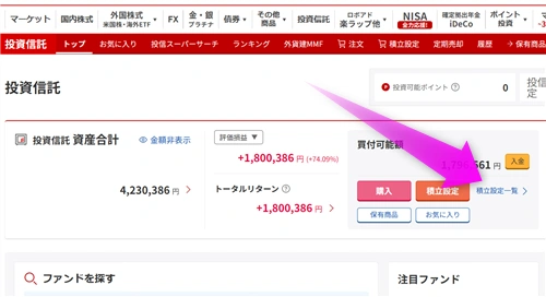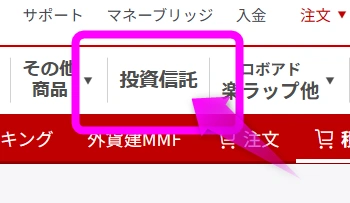 楽天証券にログインしたら、「投資信託」をクリック(もしくはタップ)します。