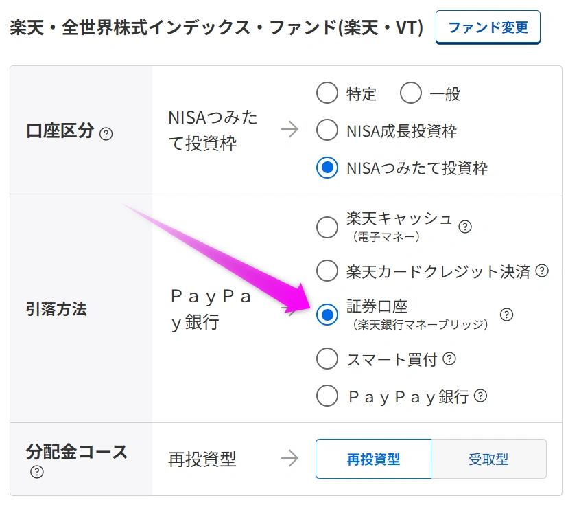 「証券口座(楽天銀行マネーブリッジ)」での引き落としを選択した場合、積立指定日に買い付けが行われるためには、積立指定日の前営業日の朝までに、証券口座に買付金額以上の資金がある必要があります。
