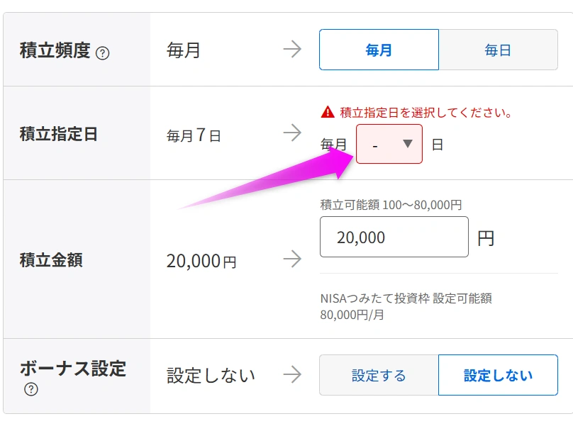 すると今までの積立指定日がリセットされてしまうので、設定しなおします。